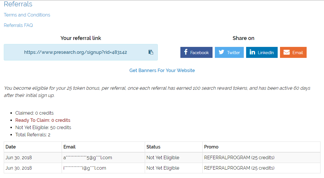 To get Referral Rewards You Need to Follow There T&C that is — “You become eligible for your 25 token bonus, per referral, once each referral has earned 100 search reward tokens, and has been active 60 days after their initial sign up.”